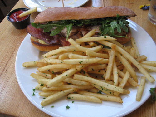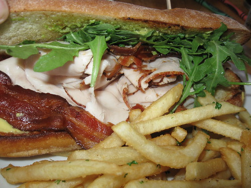 His main dish was the best thing he ate there, the turkey sandwich dressed up with arugula, bacon, guacamole and deli mustard. This is to cover the lack of actual turkey. Chuck said the bread was the best part of this sandwich. And guacamole and mustard do not mix