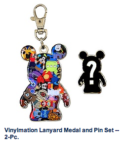 This week welcomes the addition of a new category for those of you chasing down those Disney pins modeled after Vinylmations. The first pin we have this week is the two piece Lanyard Medal and Pin set, available online for $15.95.