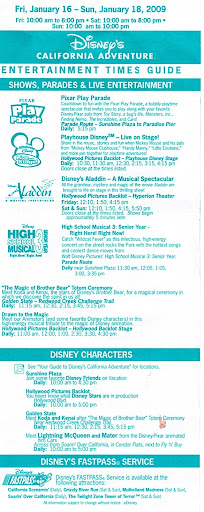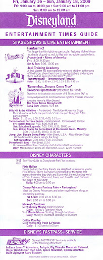 The entertainment guide is now only on one piece of paper, with Disneyland on one side & DCA on the other. One thing to note from the Disneyland side is that Remember Dreams Come True is performing for a 3 day only engagement this weekend. It returns for another 3 day engagement in February.