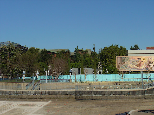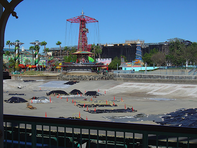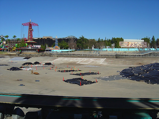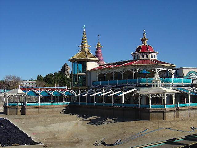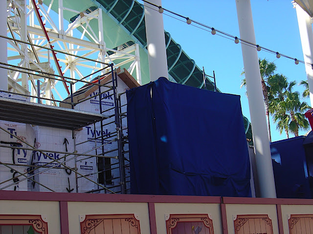 The blue shields were added around the sides of Ariel’s Grotto most likely to prevent view into the lagoon.