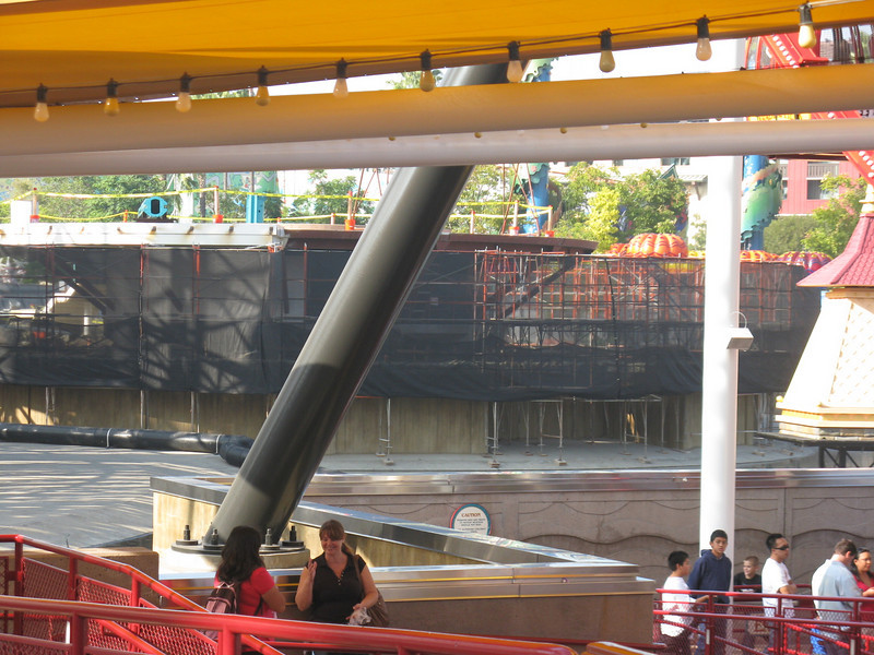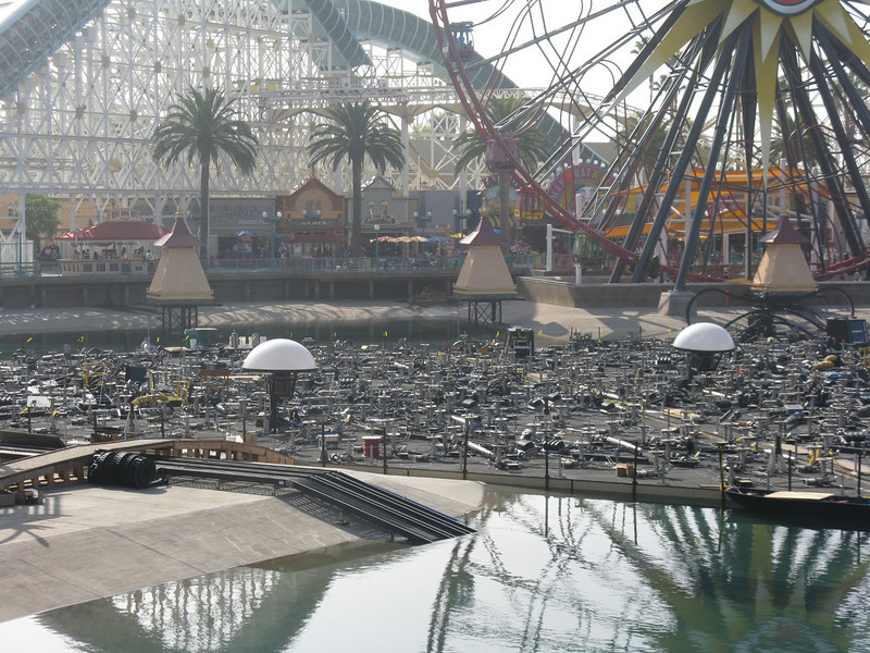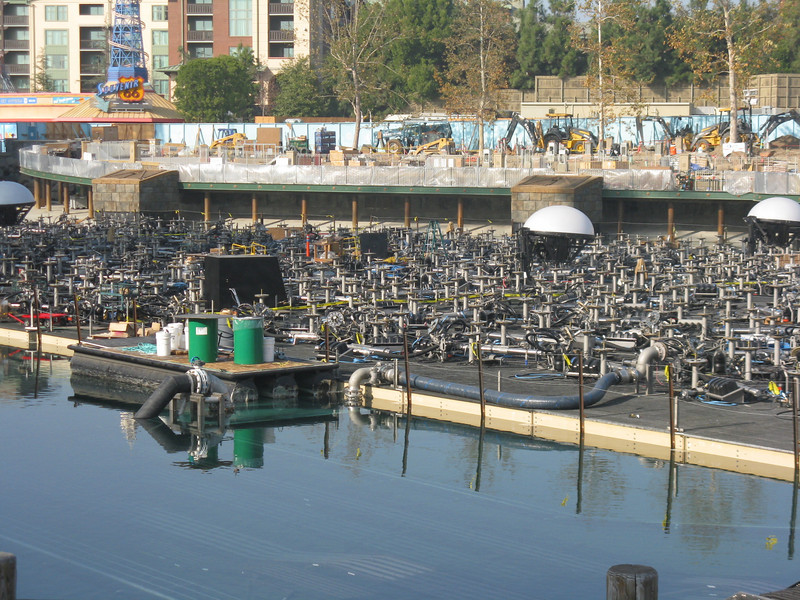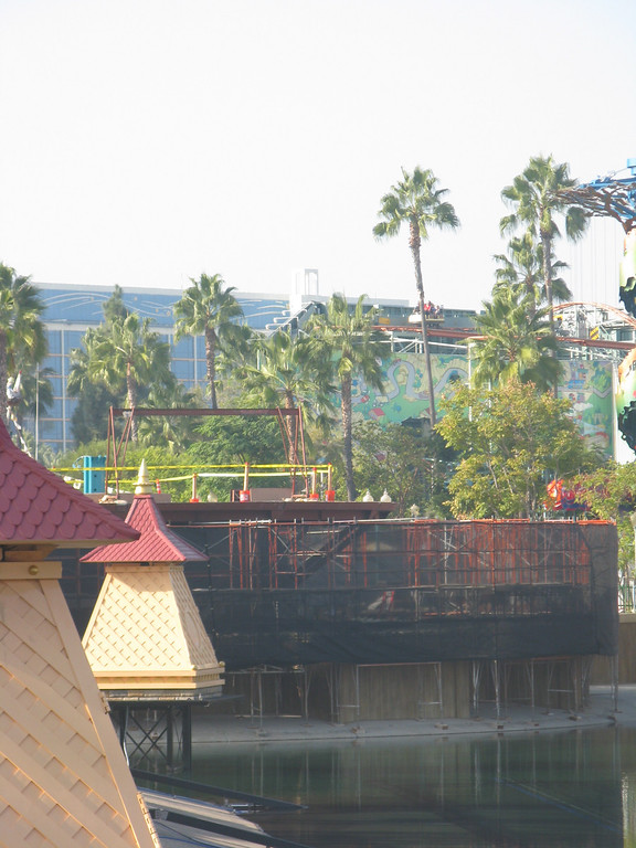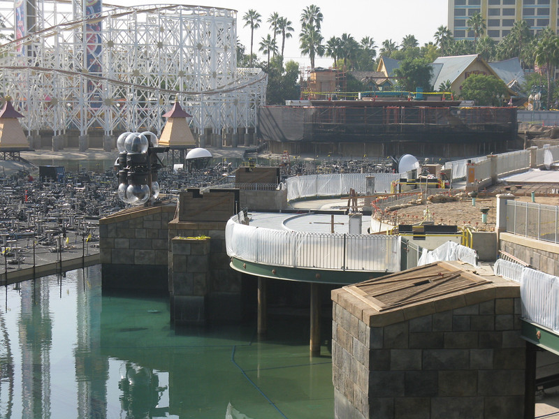 Water flowing into the lagoon on either side of the Mickey’s Fun Wheel queue