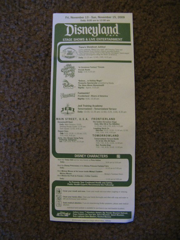The newly re-designed Disneyland times guide now features the holiday offerings as well as health and safety tips at the bottom
