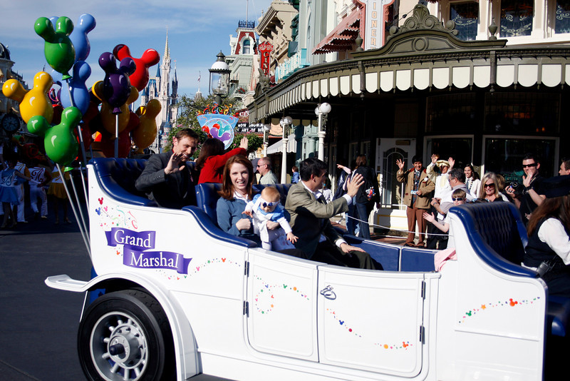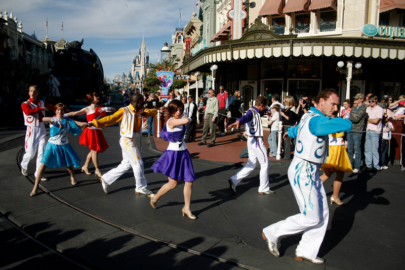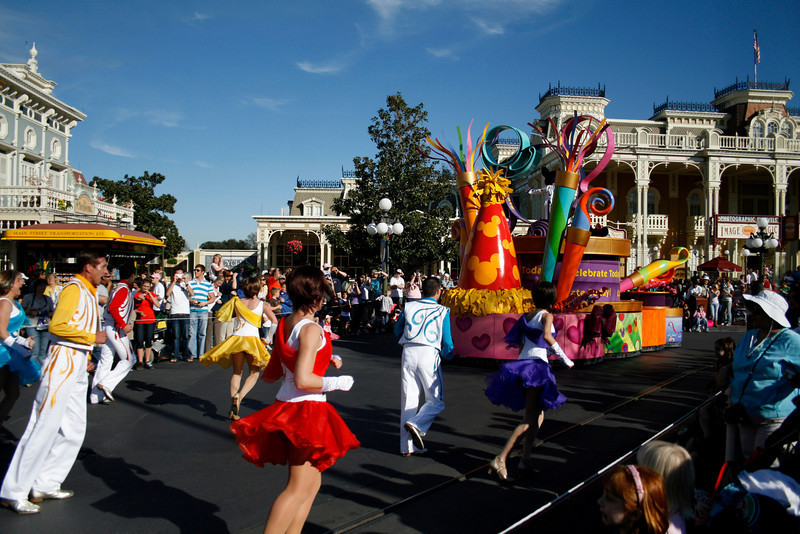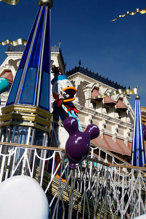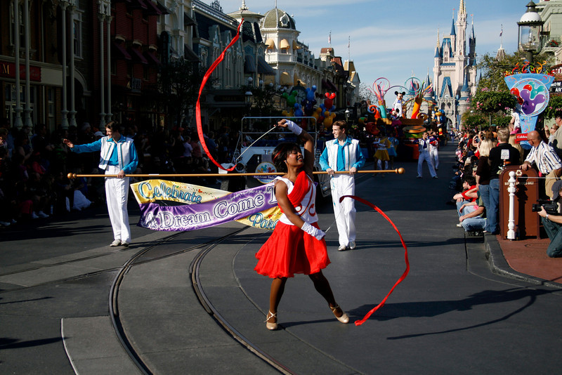We’ll start this report with photos from the debut performance of the Celebrate a Dream Come True Parade at the Magic Kingdom. Since the pre-parade vehicle is now in the actual parade, a high school band acted in it’s place