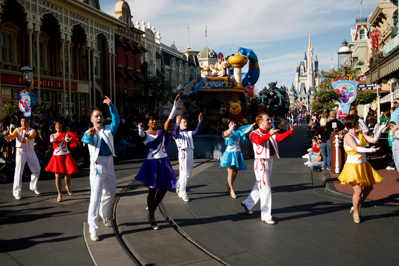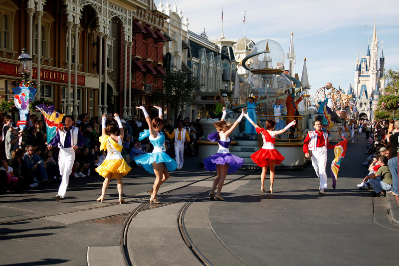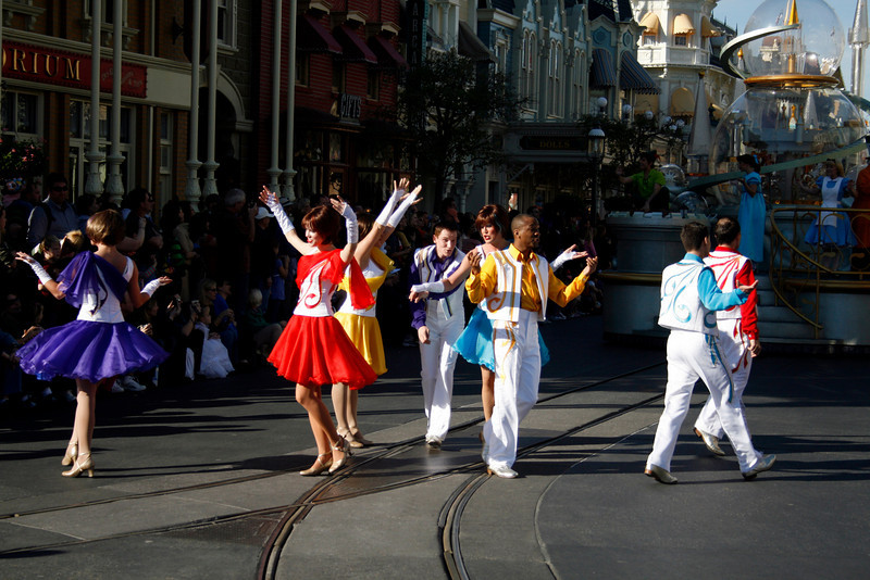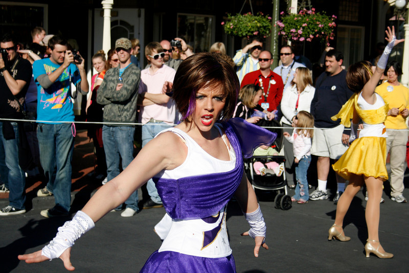 The female performers dance through the stop, while male performers spin flags. The Disney characters simply stand in place and wave their arms from left to right….