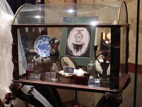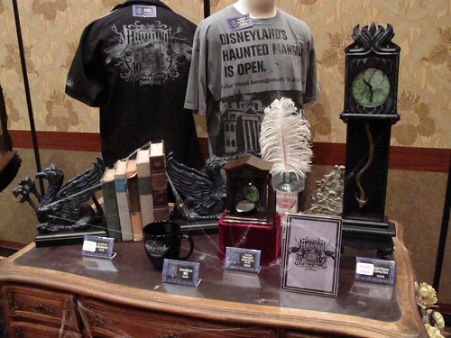 Various pieces of Haunted Mansion merchandise, from pins to sketches to models