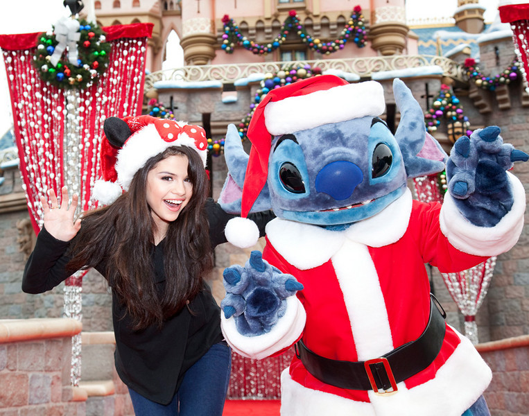 Yesterday, Selena Gomez appeared at Sleeping Beauty’s Winter Castle to tape a segment with Stitch. Here’s a picture: