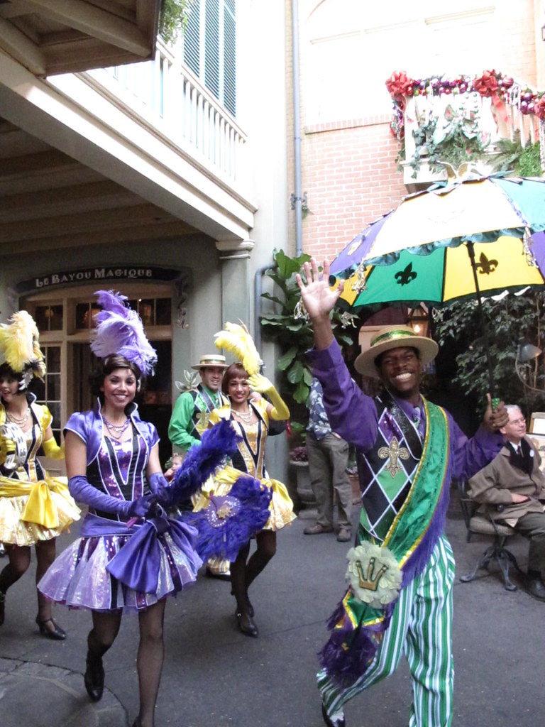 Performers making their way through New Orleans Square to the Showboat Jubilee