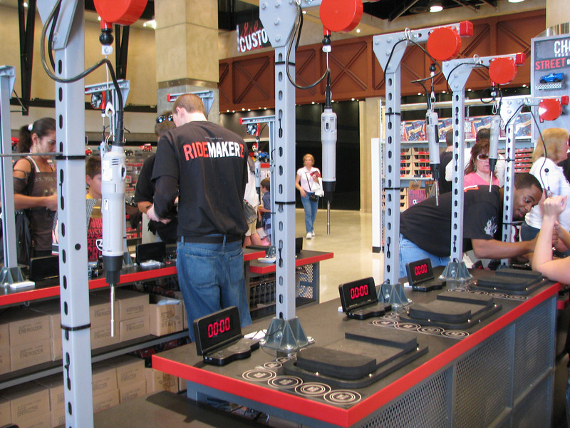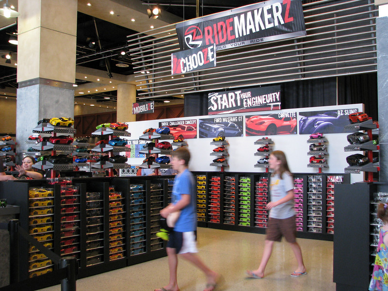 The RIDEMAKERZ experience invites guests into the ultimate car customizing shop where they can build a one-of-a-kind radio control car or “RIDE”. Between bodystyles and colors, tires and wheels, lights and sounds, accessories and decals, RIDEMAKERZ estimates there are more than 649 million possible build combinations, not including individual decal placement.