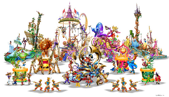 Today, we’re sharing the first preview of the artwork for Mickey’s Soundsational Parade. It gives you a glimpse of the vibrant colors and exciting array of Disney characters that may appear on the streets of Disneyland park in 2011.Plus, there are a whole lot of exciting elements for the new parade that can’t be captured in this artwork: