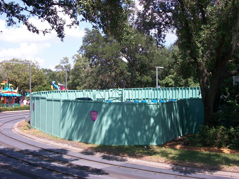 The strange Fantasyland walls in the middle of the Tomorrowland Speedway are still up