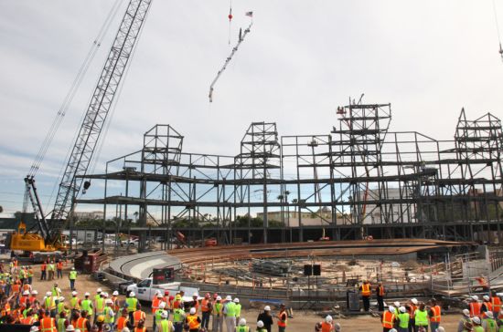 I witnessed a milestone in the multi-year expansion of Disney California Adventure park today. I joined some media and watched the “topping out” ceremony for the Cadillac Mountain Range’s tallest peak. At 125 feet, it’s the most visible part of the new 12-acre Cars Land, which is scheduled to open in 2012.