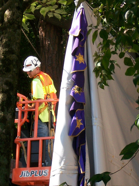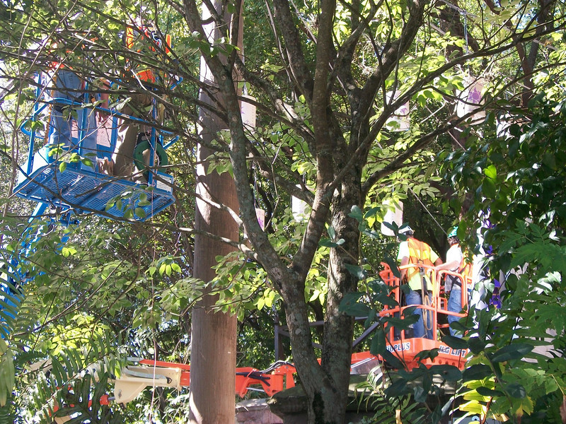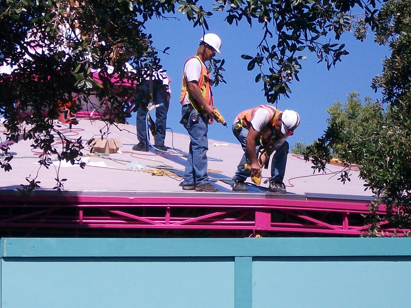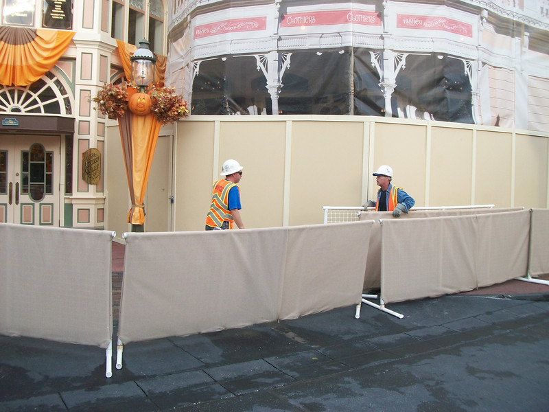 Disney Clothiers is still behind tarps, but construction workers were out in the open during the day as well