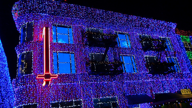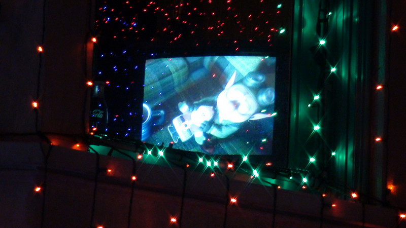 Snow falls on screens placed in the windows of one of the buildings, something new for this year