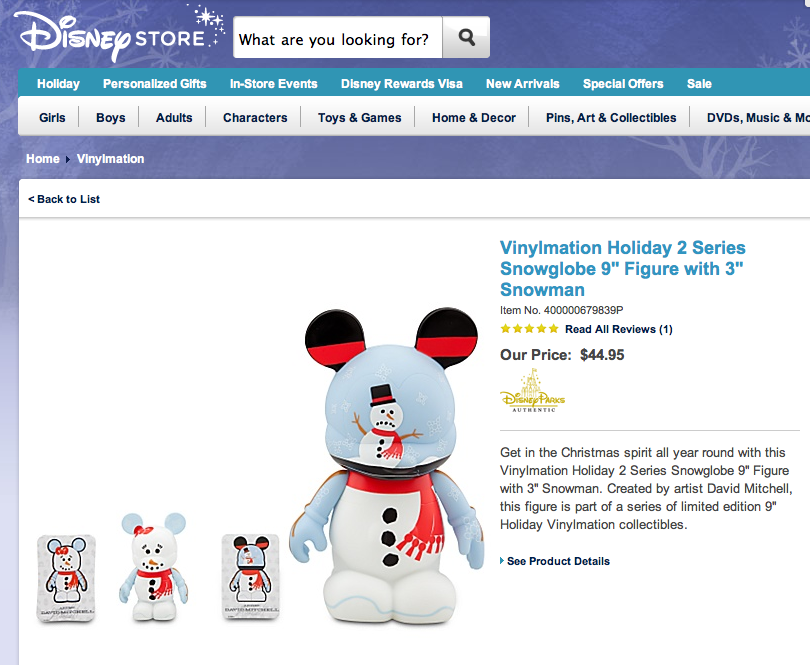 Interesting to note is the price point of this 9″, 3″ combo is only $44.95! That comes as a surprise when previous Vinylmation 9″, 3″ combos were priced at $74.95. Is Disney giving us an early Christmas present after raising the prices on Park and Urban 5? Also note the FREE SHIPPING offer if you spend $75 or more. Promo code is SHIPTODAY.