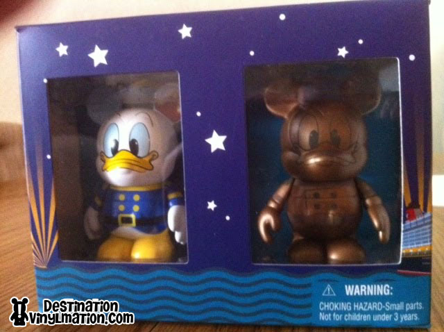 This is what arrived at my doorstep yesterday: The Admiral Donald Set! Available only from the Disney Dream’s inaugural cruise. We saw this set back at Trade City, and Nick just loves Donald, so it was only a matter of time before the set was purchased. At Trade City we saw both 3″ figures, but never knew there would be a Jr included in the set.