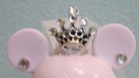 JM: I used 3″ blank Vinylmations, pearl strands, miniature ribbon flowers, 3mm & 2mm crystals, hot glue, craft glue, acrylic paint, iridescent ribbon and black ribbon.
