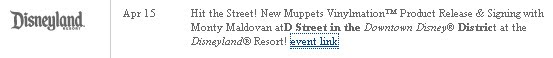 April 15th- Hit the Street! New Muppets Vinylmaiton Product Release & Signing with Monty Maldovan at D-Street in Downtown Disney District at the Disneyland Resort!