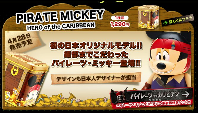4/13/11 Looks like Japan is getting a great looking Pirate Mickey Vinylmation. Vinylmationworld.com yesterday found an ad on the the Japan Disney Store website advertising this upcoming release. According to our translation of the ads, this piece will come out on April 28th and cost 1290 Yen (approx. $15.75).