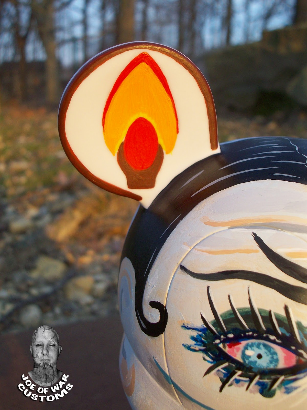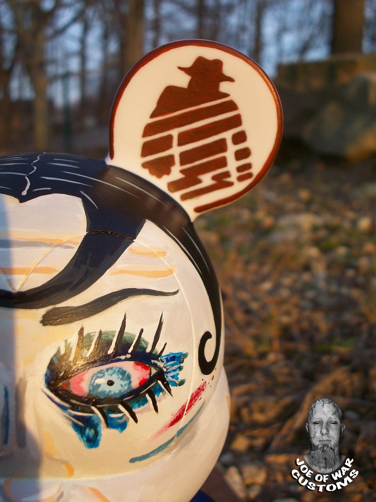 Joe: Creating art on Vinylmation is a lot of fun for me because Disney is deeply rooted in my childhood.  I loved watching the Disney movies as a kid, and being able to create artwork in the shape of Mickey now is awesome!  Painting on CYO Vinylmation is easy and enjoyable for me due to the soft smooth finish of the blank figures.  I will mostly stay true to the Mickey shape, but once in a while I might chop an ear off or add to his shape with sculpting apoxy.  A hair dryer and a sharp knife go a long way with soft vinyl!