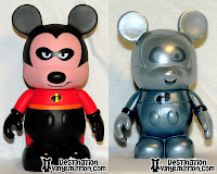 | Mr. and Mrs. Incredile and Frozone from The Incredibles. They will be inside the World Showplace (located between Canada and UK). The incredibles has an interesting Vinylmation piece. It’s a 9″ Park 2 figure of Mickey Mouse in a Mr. Incredibles costume. It comes with a 3″ Jack Jack. | |
