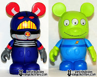 | Toy Story Vinylmation set had characters that couldn’t make it to the Pixar party: Big Baby, Buttercup, Hamm, Rex, Wheezy, and Dr. Evil Porkchop. Also 9″ versions of Alien and Zurg. And a 9/3 combo of Bo Peep and Sheep. There was also at Toy Story character released back in Park 2… Little Green Men. | |
