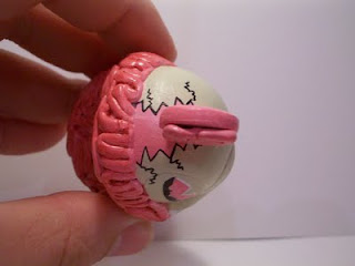 For the skull half, I painted the pie eye with some brain seen through it. The only marker I used was for the teeth and the crack on the top of the skull. I made the crack in the skull so that the ear would look like it was brain sort of coming out of the skull just for a cool effect.