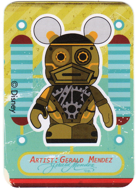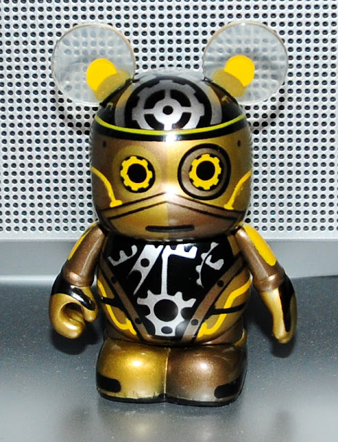 Steampunk Bot! This C3-P0 look a like was designed by Gerald Mendez (SF Golden Gate Bridge, Old Witch from Snow White, Julius 9″). Not my favorite design in the lot, but a solid concept that fits well into the series. The gloss effect is used very well here. You can see this guy, as with a few of the Robots, uses clear body parts. Steampunk Bot’s ears are clear, with light bulbs painted in.