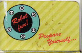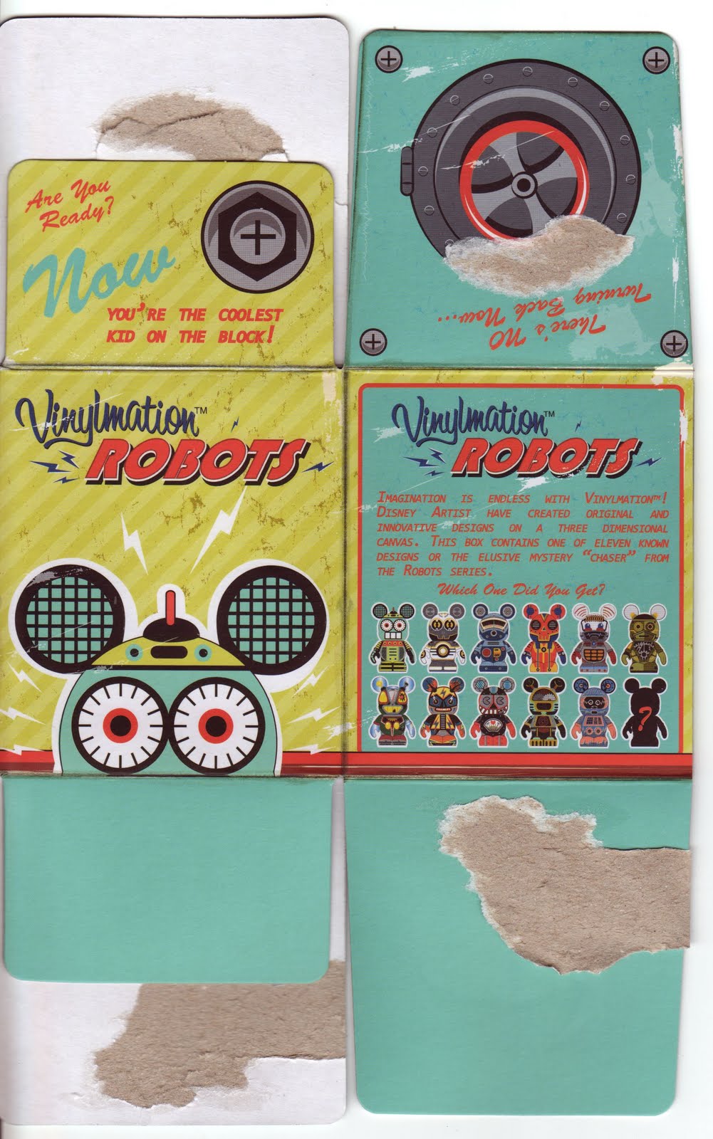 Of course, the 11 Robots and Mystery Chaser outline are shown on the back of the box. And you can see the designers “aged” the box with fake creases and tears.