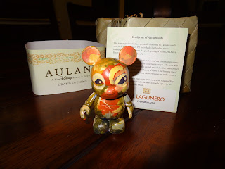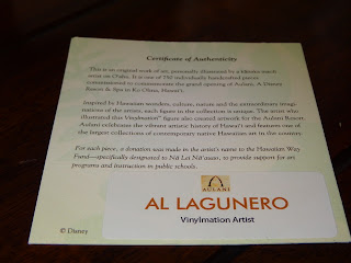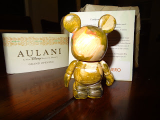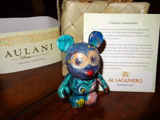 “So… hate to share this, but I just returned from Disney’s Aulani’s grand opening in Hawaii. Select press attendees staying at the resort were given a special present after the Grand Opening Presentation. A numbered and limited hand-painted Vinylmation by a Hawaiian artist housed in a 2-piece custom hand-made wicker box wrapped with a Disney’s Aulani Grand Opening sleeve of paper. Inside is a printed description and numbering. Artistically, they are definitely an acquired taste… but are EXTREMELY limited. (These are not the for-sale Menehune ones from the store — the are very crudely hand painted)”