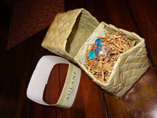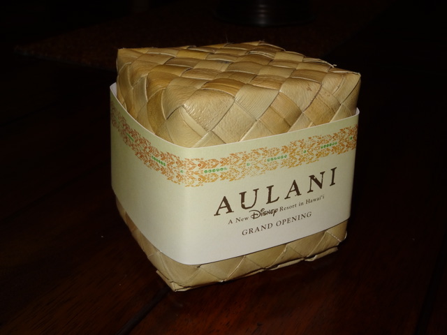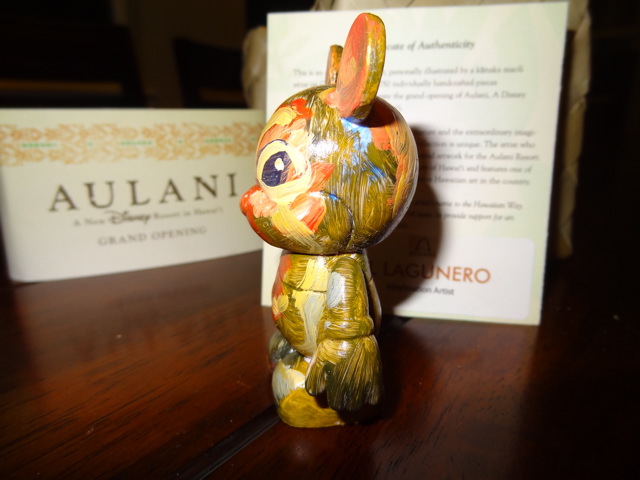 “So… hate to share this, but I just returned from Disney’s Aulani’s grand opening in Hawaii. Select press attendees staying at the resort were given a special present after the Grand Opening Presentation. A numbered and limited hand-painted Vinylmation by a Hawaiian artist housed in a 2-piece custom hand-made wicker box wrapped with a Disney’s Aulani Grand Opening sleeve of paper. Inside is a printed description and numbering. Artistically, they are definitely an acquired taste… but are EXTREMELY limited. (These are not the for-sale Menehune ones from the store — the are very crudely hand painted)”