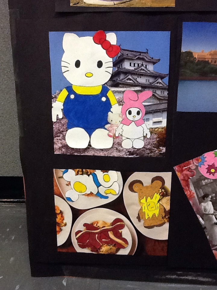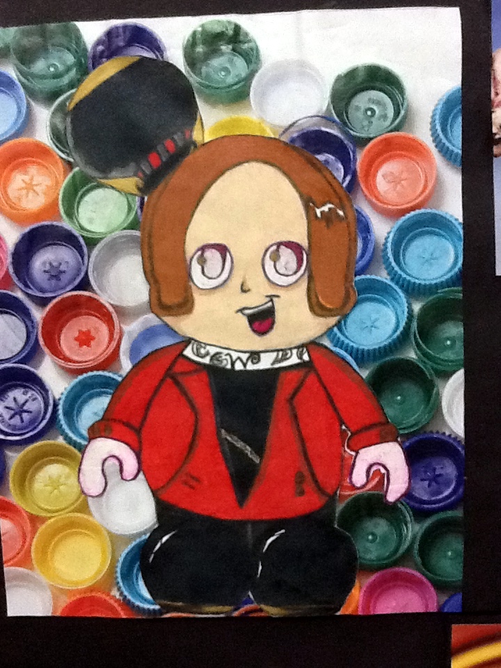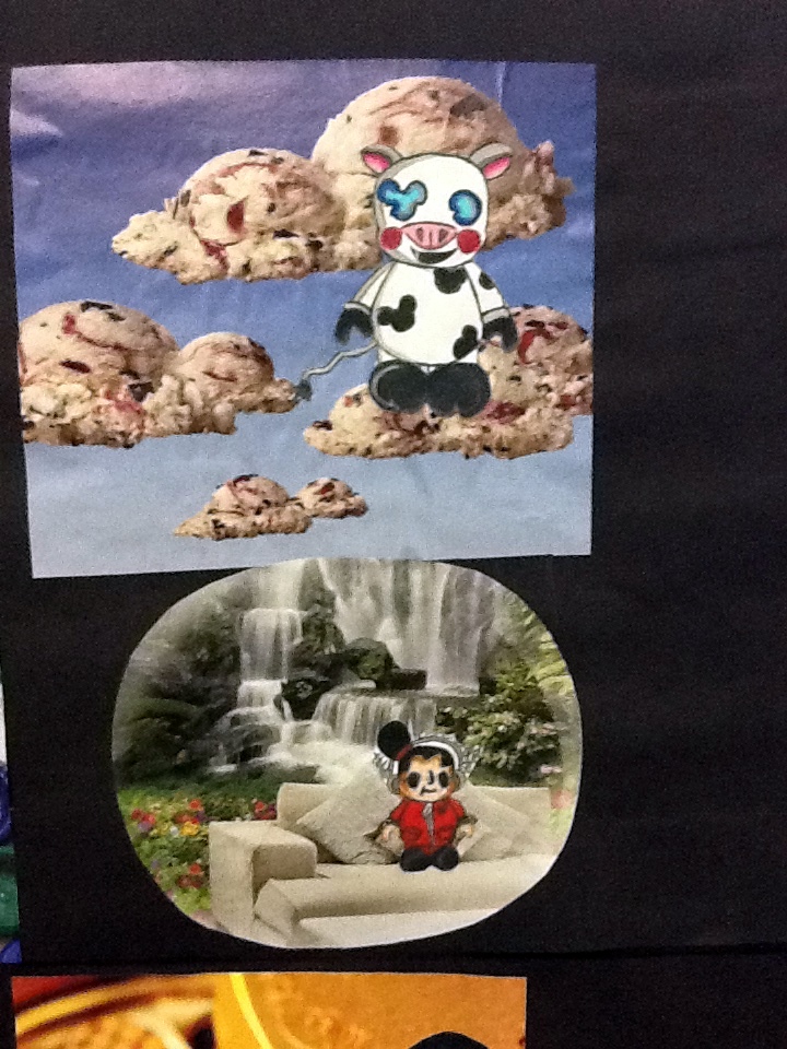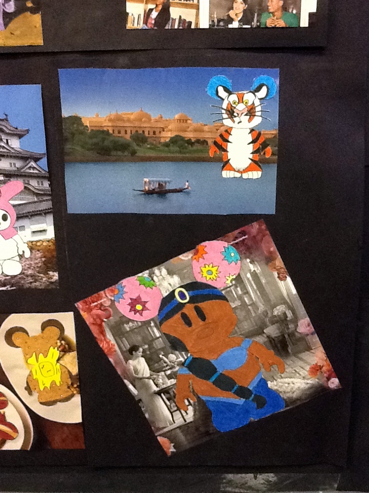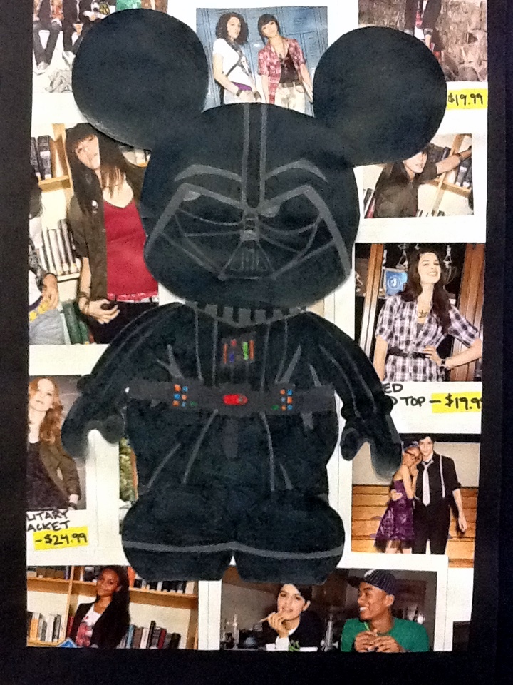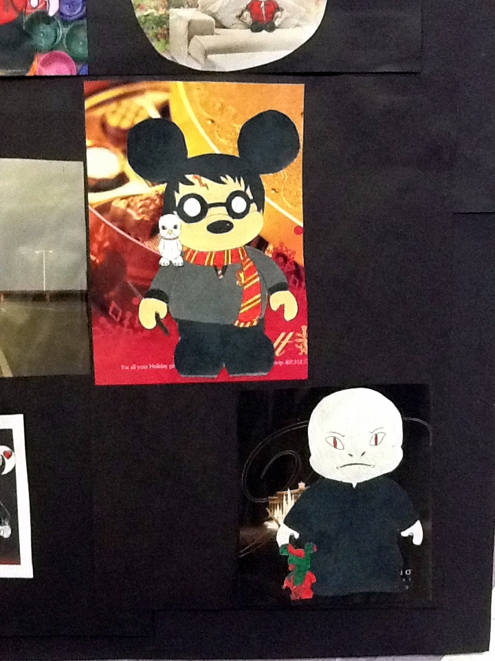2-D Design Collage- Students created 2-D Vinylmations and collaged them onto a magazine background. This project was inspired by the pictures collectors take of their Vinylmations around the parks.