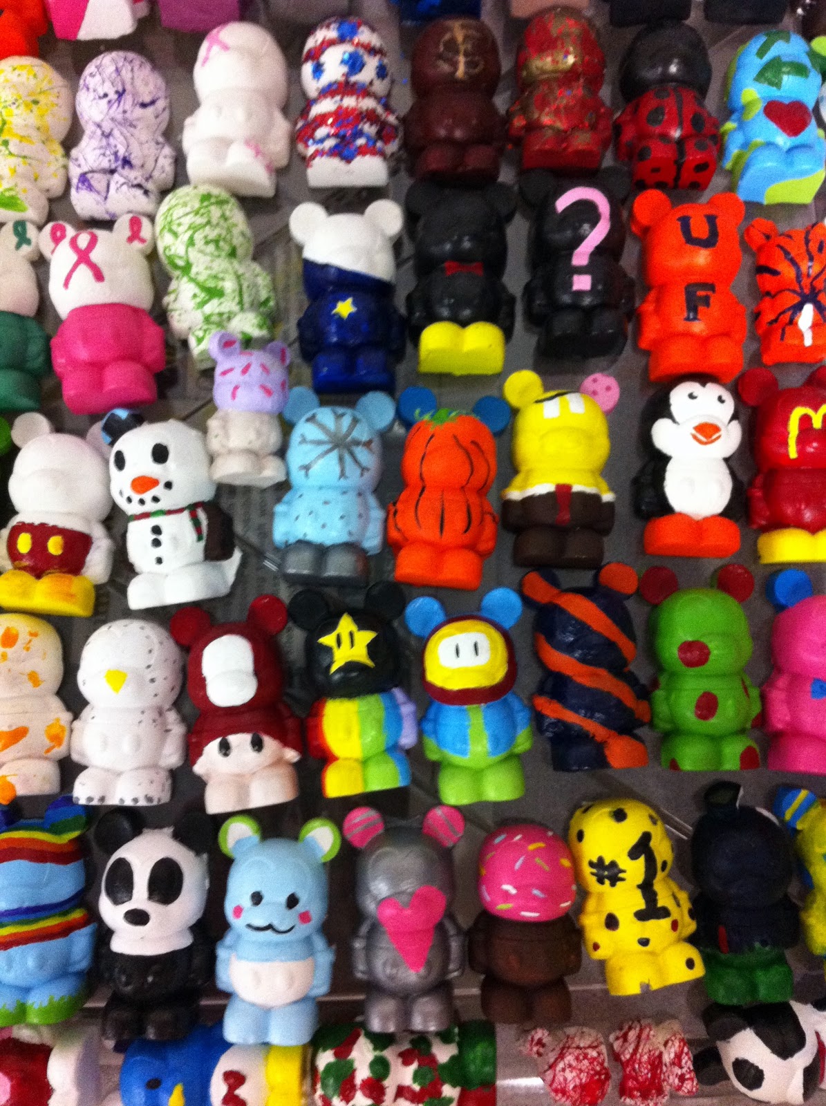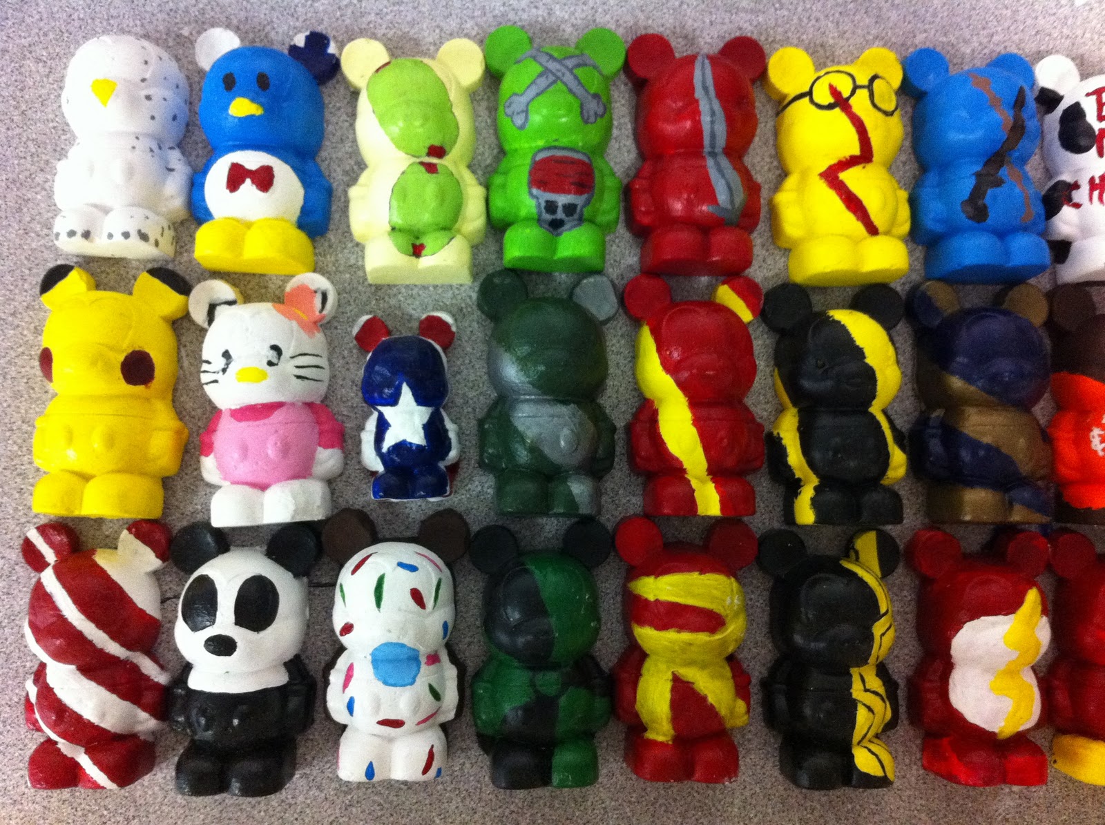 Vinylmation Class Set- For our last project, every student in class created a 3” drawn and colored version of themselves in Vinylmation form. They are currently displayed with 9” versions of myself and Brandon as a kind of “class portrait”.