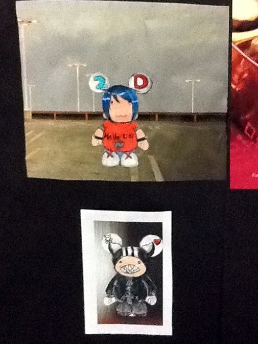 Melissa and Brandon: Originally, this unit started out with one 2-D and one 3-D project, however the student’s excitement fueled us to expand the unit. We started with a two day presentation of designer toys, Vinylmations, and an endless stream of pictures.