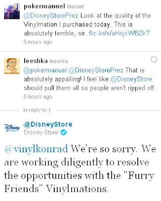The release of Furry Friends has caused a ton of commotion across the web concerning the production value of this Disney Store release. From poor paint jobs, to stains to the seeding of cases, it seems like the issues were not localized to the Costa Mesa store. At this point it we recommend collectors hold off on purchases until this matter is resolved. Here is a compilation of website comments, Emails, Tweets, Facebook posts, pictures and Disney Store responses. Please feel free to add your experiences.