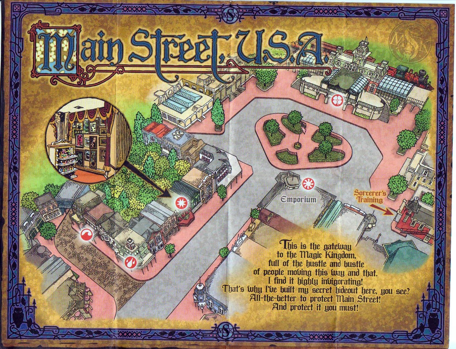 It all started when I showed up yesterday with my friend Austin just to take pictures of some Vinylmation around the park. When I was quickly whisked into the Main Street Fire house where they asked for my pass then swiped it through this machine. I thought they were onto us for sneaking behind the ropes inside the Pirates queue line to get some cool photos. But instead, I was handed 5 amazing playing cards, a Sorcerer’s Key Card and a Sorcerer’s of the Magic Kingdom map. This is the newest attraction at MK and it is included with park admission… and you get to keep the cards! I’ll tell you all about the game itself, but these cards are fantastic and I’m calling it right now… they WILL become a collectible.