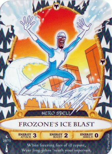 Play his card and the dog’s head appears as he Super Barks at the villain. Hold up the Headless Horseman and a flaming pumpkin head is thrown.