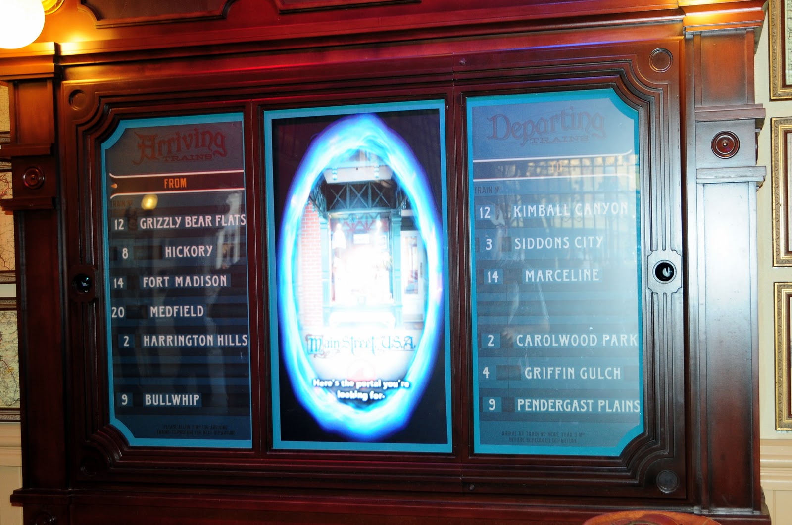 As seen on the game map, there are 20 portals, 5 in each of the 4 playing areas. Main Street USA, Adventureland, Fantasyland and Liberty Square/Frontierland. The portals are flat video screens that interact with you and your cards and are well themed as to fit in with the location where they are placed. Some were very well posistioned, like this one inside the train station that was hidden in the departure/arrival board.