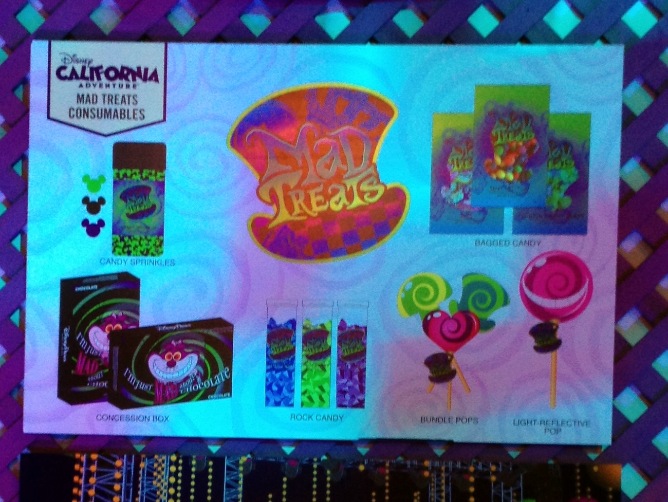 There are various items like hats, rabbit ears, t-shirts, jackets and ties. Also there will be ‘Mad Treats’ such as, light reflective lollipops, rock candy, bagged candy, and Cheshire cat candy as well as mickey sprinkles!