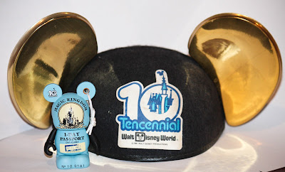 When I was 3, my dad won a photo contest which had a trip to Disney World as the grand prize. Part of the prize was being grand marshals in the 3 o’clock parade. We were also given exclusive tencennial ear hats with silver ears that, from what I understand, were not available to the general public. When I saw the artwork for the tencennial ticket vinylmation, I knew that was one that I had to have. Here is my ear hat combo with a set of our tencennial ears. You can see that the ears have yellowed a little over the past 30 years, but they’re still in great shape.