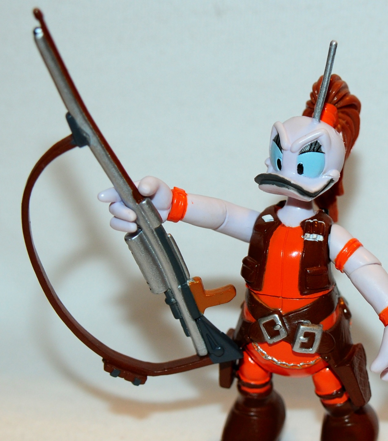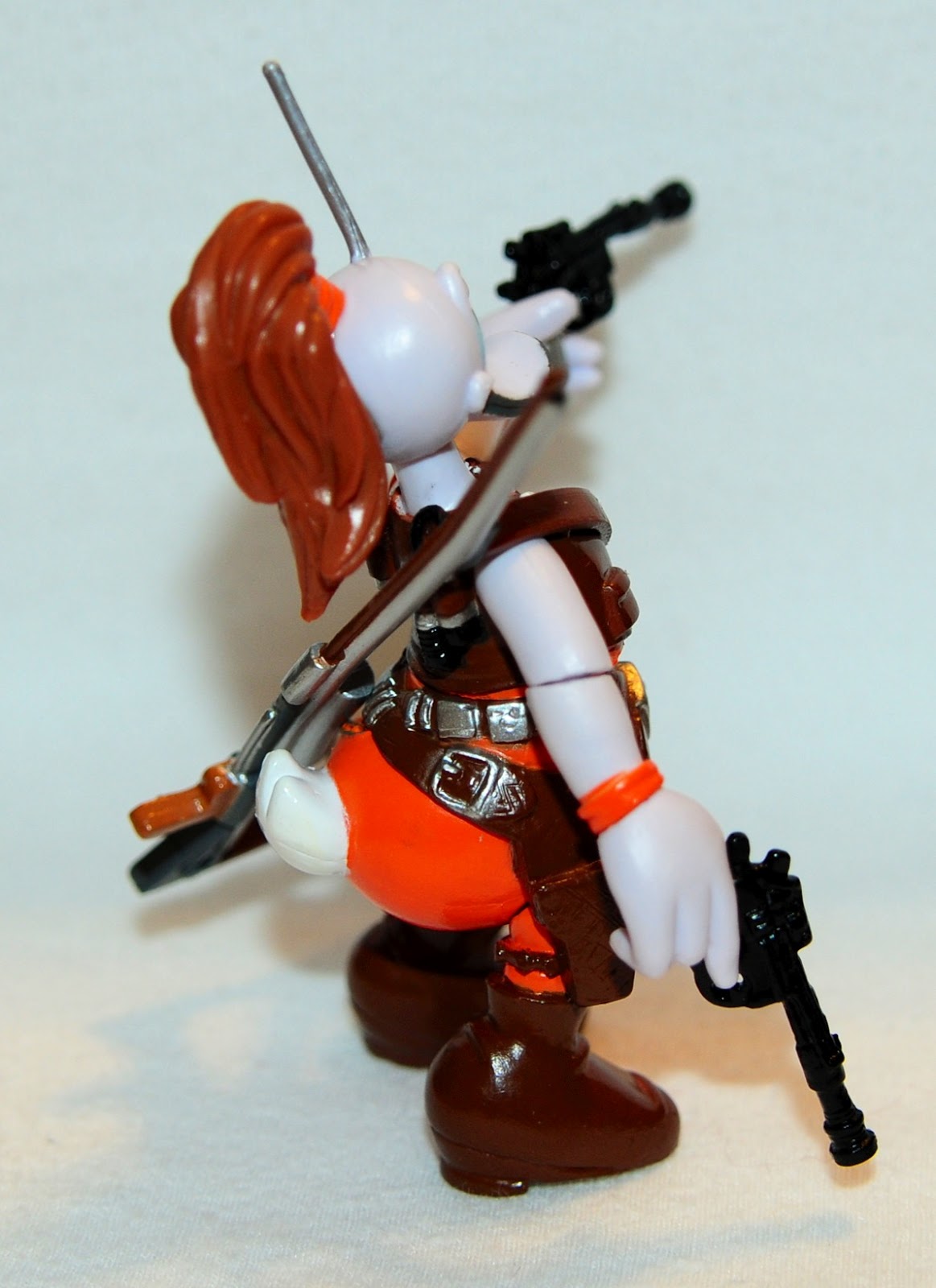 Another bounty hunter, Aura Sing, is portrayed her by Daisy Duck. A good choice for this under used Disney character. Lots of accessories here. Just like Cad Bane, Aura gets 2 hand guns, but she also gets the riffle. If I’m being picky, the right hand holds the gun well, but the left hand is a little awkward. And even though these figures seem to more poseable than past series, she can’t really hold the riffle correctly. It does however hang over her shoulder rather well.