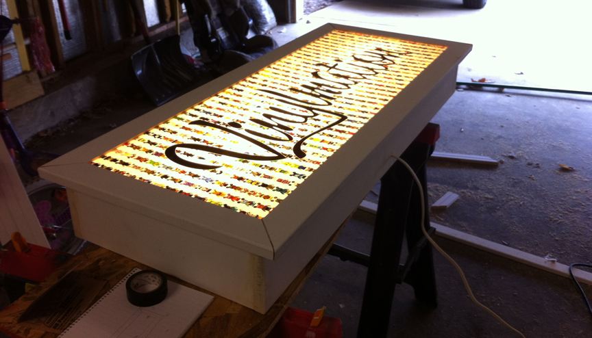 The best part, the whole thing cost me less than $30 to build it! The printer donated the printing, which is printed on a plastic material, like a back lit store sign. I bought the scrap, leftover pieces of acrylic at Lowes and the wood, paint and light fixture at the Habitat for Humanity ReStore outlet.