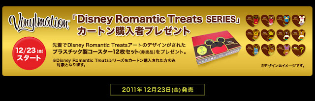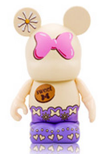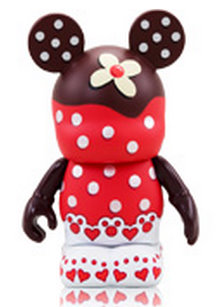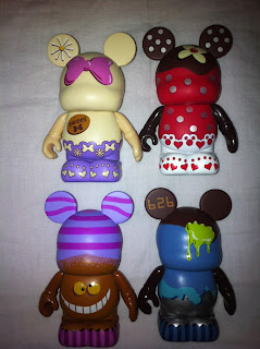 Update: 1/10/12 Lindsey (@lindols) sent in a picture of 4 Romantic Treat Vinylmation up close. I will say they look a lot better and more detailed than I thought. In face, the one I didn’t like, Donald, is now one of my favorites. The yellow candies are shaped like his feet and there is an icing swirl on top like it’s his tail and he his upside down. Also, she mentions they actually have a sweet scent to them!