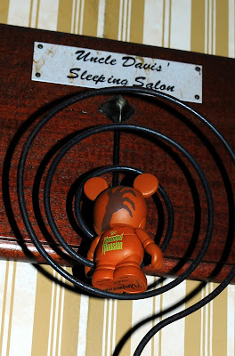 This timepiece to me is a nice tribute to a classic attraction. The pocket watch itself is the highlight for me. A really unique design that screams Haunted Mansion. With this news, I also want to share with you a Magical Moment I had today at the Magic Kingdom. Austin and myself were taking pictures of the Nightmare figures by the Haunted Mansion. We also had the Park 5 Haunted Mansion Clock with us for a picture. While setting up a shot, we were approached by a Cast Member who had talked with us a few minutes before about our collections. He asked if we wanted to take a picture in a place not everyone gets to see. We of course said sure and followed him backstage. We entered the Servants Quarters. There we saw a board on one wall full of keys. These, he said, were the room keys for the mansion. On the opposite wall were numerous bells hanging off the wall all attached to a wire that went into the wall. These bells would ring when the master in that room had summoned a servant. One of the bells read “Uncle Davis’ Sleeping Salon”, a nod to the legendary Imagineer Marc Davis who created many of the gags you see around WDW attractions, including this mansion. The Cast Member prompted us to pose our vinyl figure for a photo with this unique off-stage prop.