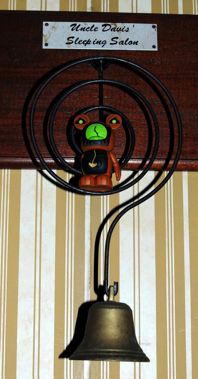 This timepiece to me is a nice tribute to a classic attraction. The pocket watch itself is the highlight for me. A really unique design that screams Haunted Mansion. With this news, I also want to share with you a Magical Moment I had today at the Magic Kingdom. Austin and myself were taking pictures of the Nightmare figures by the Haunted Mansion. We also had the Park 5 Haunted Mansion Clock with us for a picture. While setting up a shot, we were approached by a Cast Member who had talked with us a few minutes before about our collections. He asked if we wanted to take a picture in a place not everyone gets to see. We of course said sure and followed him backstage. We entered the Servants Quarters. There we saw a board on one wall full of keys. These, he said, were the room keys for the mansion. On the opposite wall were numerous bells hanging off the wall all attached to a wire that went into the wall. These bells would ring when the master in that room had summoned a servant. One of the bells read “Uncle Davis’ Sleeping Salon”, a nod to the legendary Imagineer Marc Davis who created many of the gags you see around WDW attractions, including this mansion. The Cast Member prompted us to pose our vinyl figure for a photo with this unique off-stage prop.