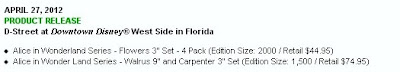Disney has just released some contradicting release date news. We were told at the March WDW trading night that the Alice in Wonderland Flowers LE set would be released on April 20th. Then, the official Disney Vinylmation blog posted an April 27th release date on their website (along with the Alice LE Walrus and Carpenter)