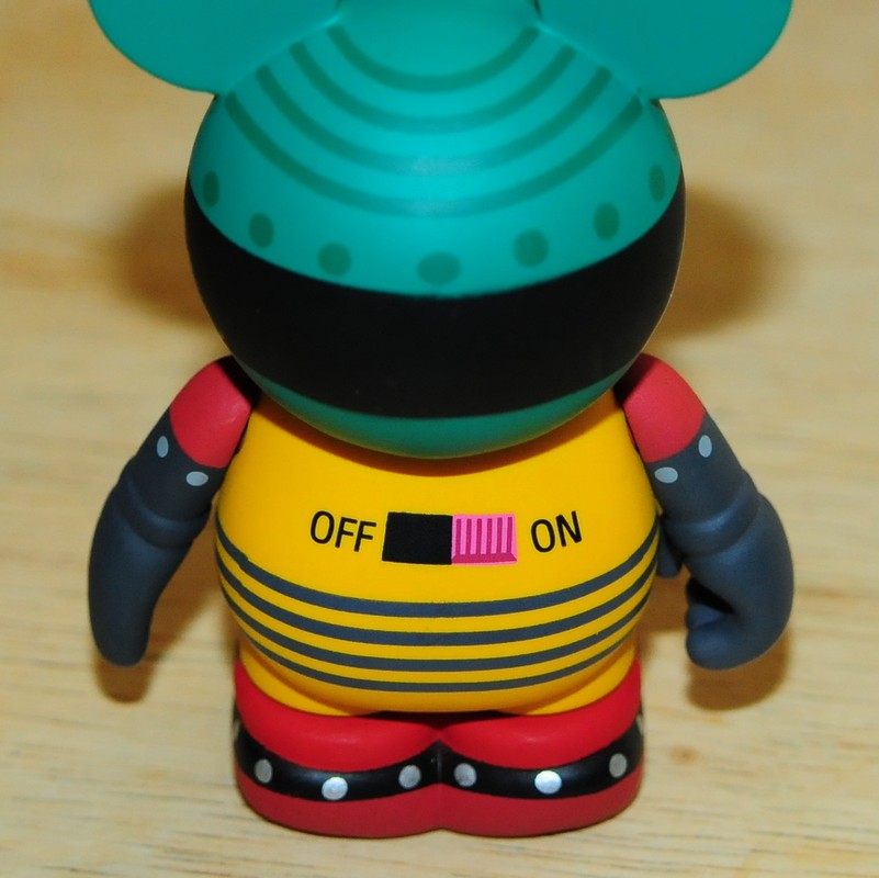 A detailed Disney store 25th Anniversary logo proudly stands out on the front, which is a bit of a shame as it won’t make sense when displaying other non 25th Anniversary Vinylmations. The very bottom of the base is a metallic silver which does help in a small way to intensify the light. Turn the base over and you’ll find the compartment for the batteries, a switch and a button. With the switch you can change from “Try” mode, in which the base can only be lit up by pressing the button continuously, or the “On” mode so that when you press the button the light will stay on until you press the button again. The light itself comes from three white LED bulbs, arranged in a triangle shape, be warned they are very bright so don’t directly look at them without a figure being in the base. The brightness does mean it can light up a small portion of the area around it. Not only does the base lite up, but it adds an extra 2cm (approx. 1 inch) to a figure’s height.