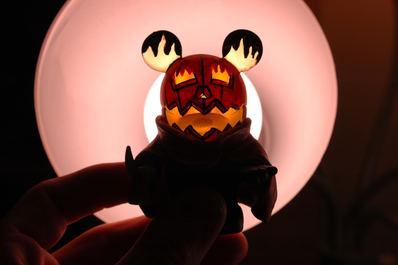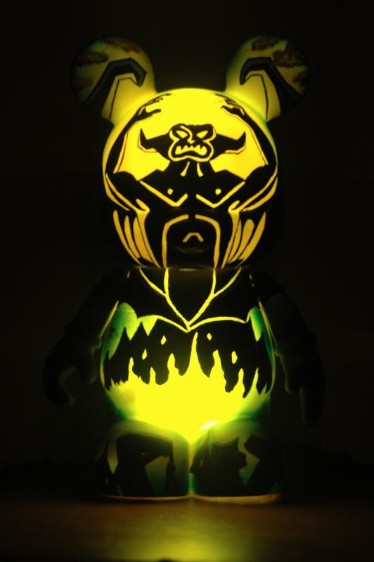 Rust This World: I decided to make the light up Chernabog because a lot of people on custom Vinylmation message boards were asking how to make a 9″ figure light up. I have some background in small electronics, so I figured I could make it work and show people how to do it. Most of my collection is villains-related, so of course I had to paint the figure to make it villain-related. I had a great design for Chernabog that I had laying around, so I figured why not make it light up as well? Now I have the coolest night light in the world.