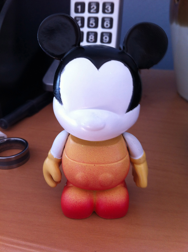Let me just say, I give everyone props who make custom Vinylmations! So much work goes in to them! A few problems I ran into with spray paint were first, to take my time to achieve a nice and uniform finish, and second to apply many light coats of paint. I saw some pooling of paint a few times. Also, just touching them would leave fingerprints on them. I also masked out the paint on the face too early and it pulled up the paint on the finished parts. The two problems I did have once the piece was complete, was a little over spray between the black and white on the head and a little sticking between one of the arms and the body. I did put a clear coat over the Vinylmation after I was done and that made it so much more durable.