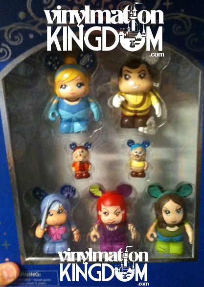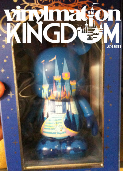 The figure depicts Cinderella’s castle in a very animated style. Even in this grainy photo we can tell the colors and artwork are beautiful. The castle steps lead down toward the feet with the glass slipper sitting on them with sparkles all around. The packaging itself add to the collectability of this piece. A blue box with stars and what looks to be Cinderella’s coach at the top. Next, is a set of Vinylmation.