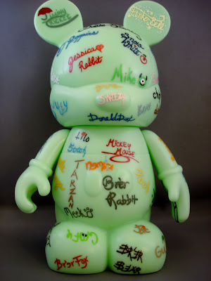 Autograph Mouse is a 9″ I did for my own collection using the 9″ Glow in the Dark. I had read about the problems people when having with their vinyls that had been signed by characters smearing. So I made up a list of all the characters I would want to have an autograph of and Googled them and found images of their autographs. For the characters that don’t give autographs (Nemo, Dory…) or don’t really make appearances in the park (Jessica Rabbit, Bolt..) I creates a signature that made me think of that character.